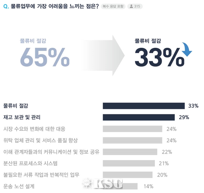 ‘물류업무에서 가장 어려운 점을 묻는 질문에 물류비절감을 꼽은 응답자가 작년엔 65%에 달했지만 올해는 33%로 크게 줄었다. 이러한 변화는 더 이상 물류 담당자들이 물류업무의 효율화를 비용절감에서만 찾지 않고, 디지털화 혹은 프로세스 개선 등을 통해 업무의 효율성을 높이기를 기대하는 것으로 해석된다. 다만 비용절감은 올해도 물류업무에서 가장 큰 현안인 것으로 나타났다.