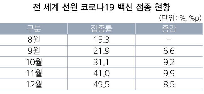 선원의 백신 접종률은 8월 15.3%에서 10월 30%를 넘어선 데 이어 11월 40%를 돌파했고 12월엔 50%에 근접했다. GMF는 선원들의 백신 접종 기피 현상이 여전히 보고되고 있고 일부 지역에선 백신 공급 문제가 계속해서 발생하고 있다고 최근의 선원 백신 접종 상황을 평가했다. 아울러 앞으로 부스터샷(추가 접종)이 새로운 도전으로 떠오를 거란 전망이다.