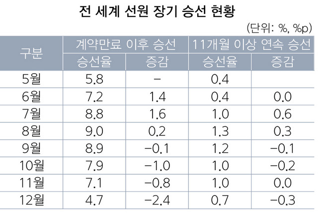 선원 교대도 원활히 이뤄지고 있다. 12월 현재 계약기간 종료 이후 배에서 내리지 못하는 선원 비중은 4.7%까지 떨어졌다. 지난 8월 9%까지 확대됐다가 시간이 지날수록 감소하는 추세다. 특히 11월과 12월 사이 2.4%p 감소하며 조사를 시작한 5월 이후 최소치를 기록했다. 11개월 이상 연속 승선한 선원도 1%대 아래로 떨어졌다.