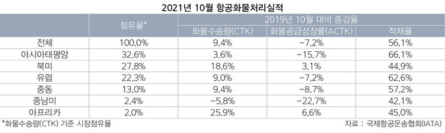 국제항공운송협회(IATA)에 따르면 지난해 10월 전 세계 항공사 취급한 화물수송량(CTK·톤킬로미터)은 코로나19 이전 시기인 2019년 같은 시기와 견줘 9.4% 증가한 것으로 나타났다. 지역별로 처리실적을 살펴보면 중남미를 제외한 대부분의 항공사들이 호실적을 거뒀다.
