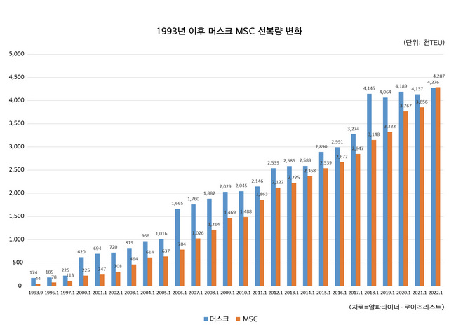 머스크는 지난 1993년 자국 선사 EAC를 인수하며 세계 1위에 올랐다가 1995년부터 2년간 경쟁사인 시랜드와 대만 에버그린의 부상으로 2~3위에 머물렀다. 당시 세 선사의 선복 차이는 1만TEU에 불과했다.