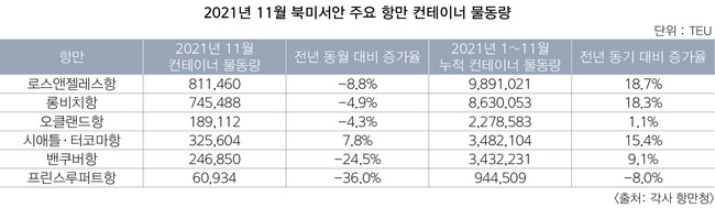 미국의 수입 수요 강세에도 항만 적체 등 대외 변수에 시애틀·터코마항(NWSA)을 뺀 북미서안 6개 항만의 11월 컨테이너 물동량이 마이너스 성장을 나타냈다. 전국소매연맹에 따르면 지난해 소매 판매가 팬데믹 이전 최고치를 달성한 2019년보다 더 낮은 수준을 보일 것으로 예상했다.