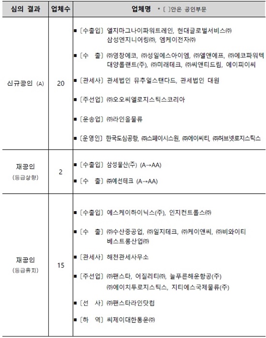이번에 현대글로벌서비스 오오씨엘로지스틱스코리아 라인올물류 한국도심공항 허브넷로지스틱스 등이 신규로 공인을 받았으며, 늘푸른해운항공 어질리티 에이치투로지스틱스 지티에스국제물류 팬스타 CJ대한통운 등이 재공인을 받았다.