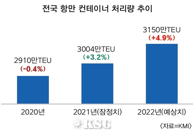 이기열 한국해양수산개발원(KMI) 항만수요예측센터장은 지난 19일 온라인으로 열린 ‘2022 해양수산 전망대회’에서 2020년 전국 항만 컨테이너 물동량은 신종 코로나바이러스 감염증(코로나19) 여파로 0.4% 감소한 2910만TEU에 그쳤지만, 이듬해 3.2% 증가한 3004만TEU를 기록, 사상 처음으로 3000만TEU를 돌파할 것으로 예상했다. 2011년 2000만TEU를 넘어선 이후 10년 만에 3000만TEU를 돌파하며 연간 최고치를 기록할 것으로 보인다.
