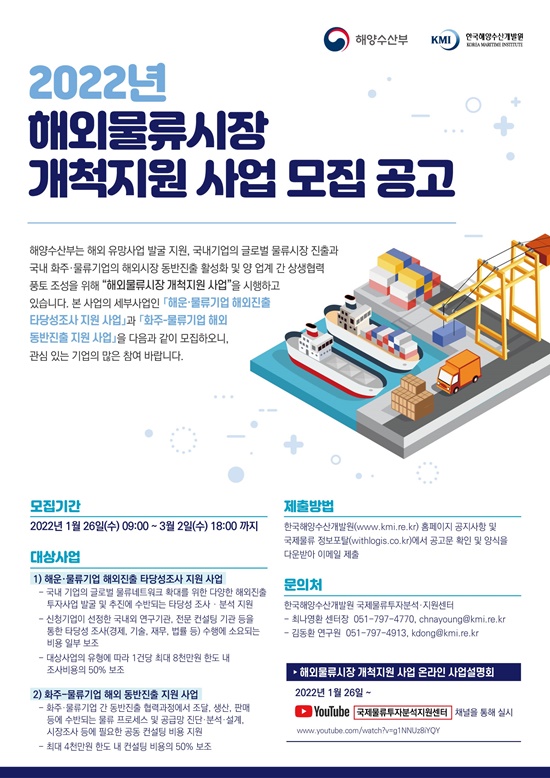 해양수산부는 ‘2022년 해외 물류시장 개척지원사업’ 지원 대상 기업을 선정하기 위해 1월26일부터 3월2일까지 신청자를 공개 모집한다고 밝혔다.