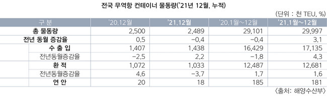 글로벌 경기 회복과 물동량 호조 지속 등에 힘입어 코로나19 이전 수준으로 회복할 수 있었다는 분석이다. 인천항도 ‘컨’ 물동량 역대 최대치를 경신하며 승승장구했다. 특히 동남아 선복 인센티브 제도와 특별 임시선박 추가 투입 등 수출입 물류 지원을 위한 비상경영체제를 운영한 게 주효했다.