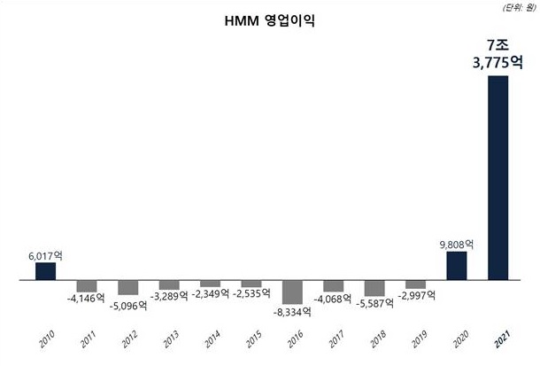 하지만 2020년부터 신종 코로나바이러스 감염증(코로나) 확산, 본격적인 초대형 선박 투입으로 1240억원의 당기순이익을 내며 턴어라운드에 성공했다. 지난해엔 창사 이래 사상 최대인 당기순이익 5조3262억원을 기록, 지난 9년간의 당기순손실을 대부분 상쇄하는 성과를 올렸다.
