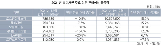 델타·오미크론 등 코로나19 변이 바이러스 확산에도 지난해 북미 서안 주요 항만의 컨테이너 물동량이 3000만TEU를 넘어서며 역대 최대치를 달성했다. 물류 병목현상과 더불어 코로나발 보복소비에 따른 수요 급증이 영향을 끼쳤다는 분석이다. 다만 섀시 등 컨테이너 장비난과 인력 부족으로 서안 항만의 생산성 저하 문제가 여전히 심각한 것으로 알려졌다.