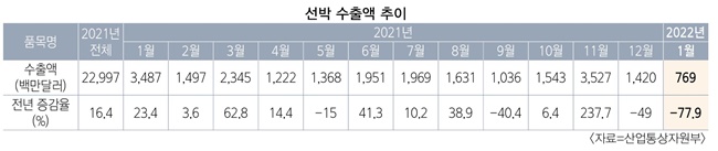 다만 국내 조선사들의 수주액이 크게 늘면서 향후 선박 수출액은 증가할 것으로 보인다. 산업부는 “물동량 증가와 글로벌 친환경 정책 확대 영향으로 국내 기업 수주는 호조세를 보이고 있지만 수주 인도 간 시차와 전년 동월 선박 수출 기저효과 영향으로 1월 선박 수출이 감소했다”고 전했다.