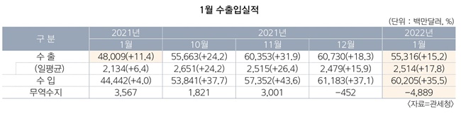 수입도 양호한 실적을 거두며 우리나라의 수출입 모두 순조로운 새해를 맞이했다. 우리나라의 1월 수입액은 전년 대비 35.5% 증가한 602억1000만달러(약 71조8900억원)를 달성했다. 최근 에너지가격 급등과 수출 확대에 동반한 중간재 수입 확대 등의 영향으로 14개월 연속 증가세를 유지했다. 무역수지는 수입이 더 큰 폭으로 증가하며 -48억9000만달러를 냈다.