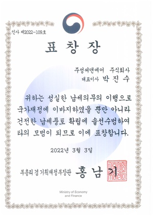 박진수 주성씨앤에어 대표는 3일 제56회 ‘납세자의 날’을 맞아 납세의무를 성실히 이행한 공로를 인정받아 모범납세자로 선정, 기획재정부장관 표창을 받았다.