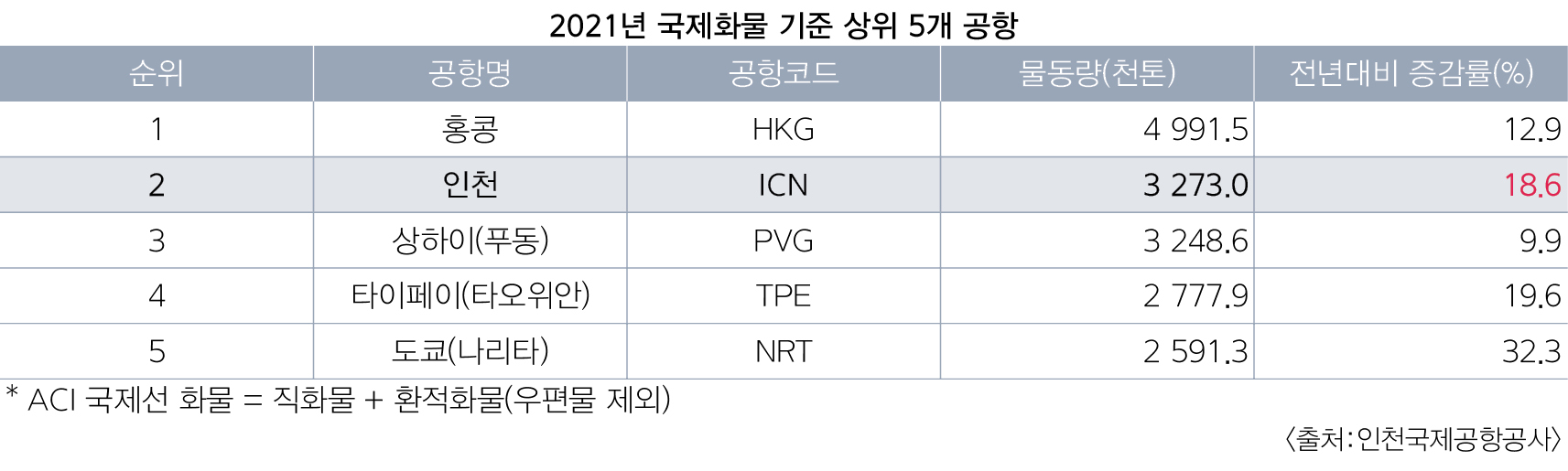 2001년 개항 시 연간 120만t에 불과했던 인천공항 항공화물 물동량은 2004년 연간 213만t을 기록했고, 연평균 3.6%씩 꾸준히 성장해 17년 만인 2021년 최초로 연간 300만t을 돌파했다.