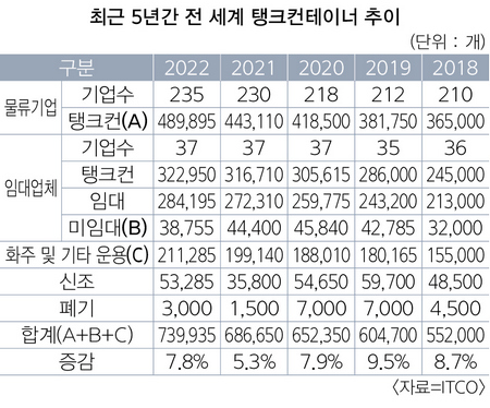 국제탱크컨테이너기구(ITCO)에 따르면 올해 1월1일 현재 세계 탱크컨테이너 개수는 73만9900개를 기록, 지난해의 68만6600개에 견줘 7.8% 증가했다. 통계를 내기 시작한 1992년 이후 처음으로 70만개 고지를 넘어섰다.