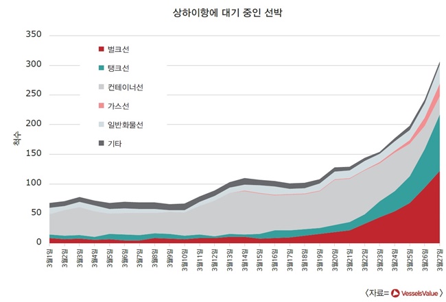 영국 베셀즈밸류에 따르면 3월27일 현재 상하이항 인근에 떠있는 선박은 306척으로 집계됐다. 지난해 같은 기간 87척과 비교해 252%, 연초 90척에 견줘 240% 폭증했다. 2017~2021년 평균인 75척과 비교하면 308% 급증한 셈이다.