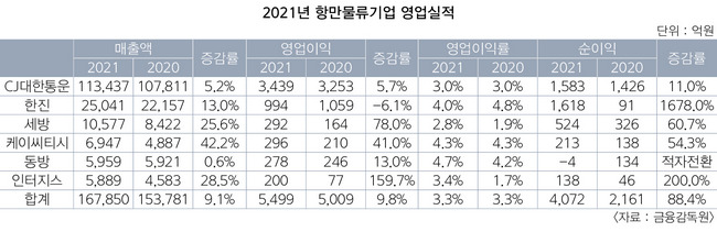 한진 측은 “상반기 일부 택배기사 파업, 택배종사자 근로환경 개선 비용 등으로 수익성이 감소했으나 하반기 비용절감과 투자 확대를 통해 운영 효율성을 높여 수익성이 일부 회복됐다”고 설명했다. 이어 “글로벌 경기회복으로 항만물동량이 증가해 컨테이너터미널 자회사의 실적이 큰폭으로 개선됐다”며 “글로벌 전자상거래의 지속적인 성장 속 인천공항 GDC를 활용해 당일배송 서비스를 제공한 효과”라고 말했다.