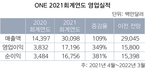 ONE은 2021년 회계연도(2021년 4월~2022년 3월) 영업이익은 전년 38억3200만달러 대비 4.5배(349%) 신장한 171억9600만달러(약 21조6500억원)를 기록했다고 밝혔다. 올해 1월 전망한 158억달러와 비교해 8.8% 늘어난 수치다.