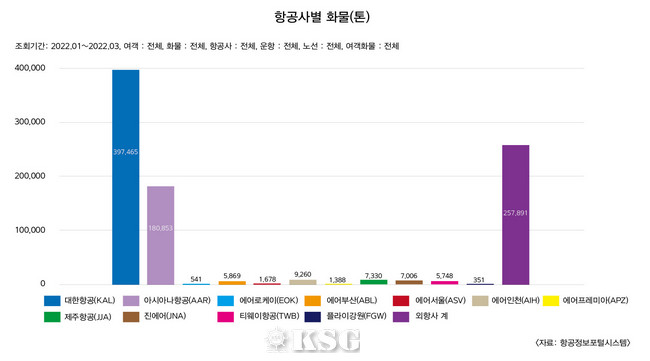 최근 국토부의 항공면허 조건 변경 결정에 따라 기사회생한 신생 LCC 에어프레미아와 에어로케이는 각각 1388t 541t의 화물을 소화했다. 플라이강원은 1년 전 같은 시기보다 271t 늘어난 351t을 신고했다.