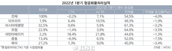올해 1분기 세계 항공화물시장의 화물수송량 증가율(CTK·톤킬로미터)이 마이너스로 마감했다. 우크라이나 사태, 코로나19 장기화 등 대외 악재에 따른 공급망 붕괴로 인플레이션 압력이 가중된 게 영향을 끼쳤다는 분석이다.