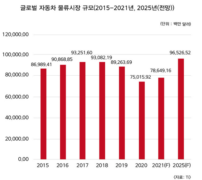 글로벌 자동차 물류시장 규모는 2025년 965억2652만달러를 기록하며 연평균 6.51% 성장할 것으로 내다봤다. 이는 코로나 사태가 장기화됐던 2021년과 2020년과 견줘 각각 22.7% 28.7% 늘어난 수준이다.