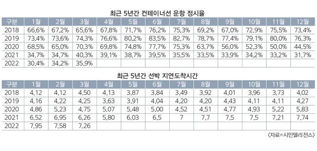 선박 지연 도착은 소폭 줄어들었지만 9개월 연속 7일대를 기록 중이다. 3월 평균 지연 도착 시간은 7.26일로 전월 대비 0.32일 줄었다. 다만 전년 6.26일과 비교하면 1일 늘어나 선박 지연이 여전히 심각한 것으로 파악됐다.