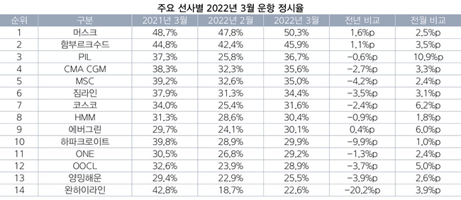 3월 가장 높은 정시 운항률을 달성한 선사는 50.3%를 기록한 덴마크 머스크로, 유일하게 50%대를 달성했다. 2020년 2월 이후 14개월 연속 세계 1위 자리를 지켰다. 머스크의 정시율이 50%를 웃돈 건 2020년 12월 이후 16개월 만이다.