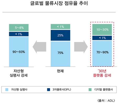글로벌 경영컨설팅사인 ADL은 2030년 3PL을 대체할 디지털 플랫폼 기반의 사업자들의 강세를 전망했다. 현재 물류시장에서 3PL의 시장점유율은 25% 수준에 이르나, 2030년 1%까지 후퇴할 것으로 분석했다. 반면 디지털 플랫폼 사업자들은 최대 93%까지 점유하며 올해보다 약 20%p(포인트) 성장할 것으로 내다봤다.