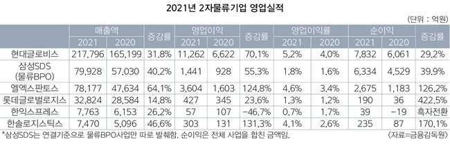 한솔로지스틱스는 물류 호황과 더불어 육송업체 인수합병, 배터리 물류사업 등의 성장세에 힘입어 수익성이 대폭 개선됐다. 이 기업의 지난해 매출액은 46.6% 증가한 7470억원을 기록했다. 영업이익과 순이익은 각각 2.3배(131.3%) 2.7배(170.1%) 오른 303억원 235억원으로 집계됐다.