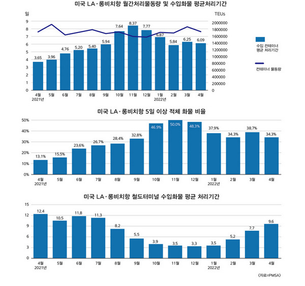 미국 오클랜드 소재 태평양상선협회(PMSA)에 따르면 지난 4월 로스앤젤레스(LA) 롱비치 두 항구에서 수입 컨테이너가 화물차에 실려 반출되기까지 걸린 시간은 평균 6.09일을 기록했다. 3월에 비해 0.16일 줄었지만 두 달 연속 6일대를 유지했다.