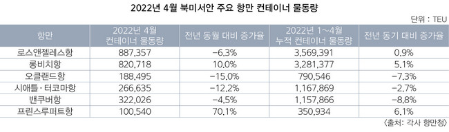 롱비치항과 프린스루퍼트항의 선전에도 북미 서안 항만이 3개월 만에 물동량 하락곡선을 그렸다. 다만 중국 상하이 등 봉쇄 조치가 점차 완화됨에 따라 성수기와 더불어 향후 물동량 실적이 빠른 속도로 회복될 거란 전망이 잇따랐다.