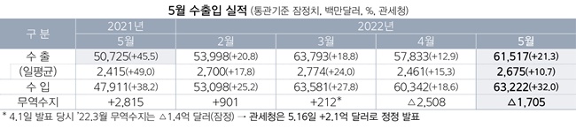 우리나라의 5월 수입액은 전년 대비 32% 증가한 632억2000만달러(약 79조4300억원)를 기록했다. 높은 에너지·원자재 가격으로 600억달러를 상회했다.