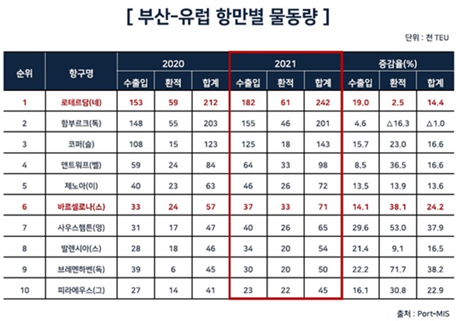 항만별로는, 로테르담이 14.4% 증가한 24만2000TEU로 1위를 차지하며 유럽에서 부산항과의 교역이 가장 활발한 항만으로 꼽혔다.