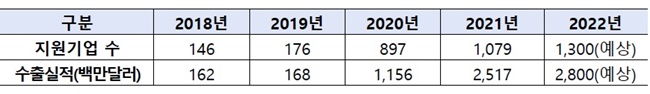 같은 기간 수출실적 역시 1억6200만달러에서 25억1700만달러로 15.5배(1454%) 급증했다. 올해는 지원기업 수와 수출실적이 전년 대비 각각 20% 118% 증가한 1300곳 28억달러로 늘어날 전망이다.