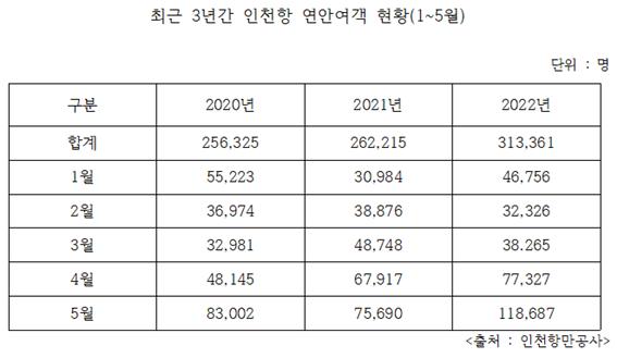 이는 국내에 코로나19가 본격적으로 확산되기 시작한 2020년 이후 가장 높은 기록이다. 2019년 인천항 연안여객은 100만3000명이었으나, 2020년과 2021년에는 각 76만3000명, 76만 8000명으로 집계됐다.