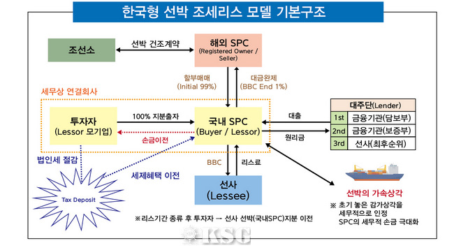 이 본부장에 따르면 선박조세리스제도의 구조는 이렇다. ①단수 또는 복수의 투자자가 국내 특수목적법인(SPC)을 설립하고 지분 100%를 출자하면 ②선사는 선박을 발주한 뒤 해외 SPC에 계약을 이관하고 국내 SPC는 최후순위를 포함한 선·중순위 선박금융을 조달하고 할부매매를 통해 선박을 소유한다.(99% 초기 납입)