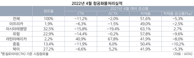 지난달에 이어 4월 항공화물수송량도 부진했다. IATA에 따르면 올해 4월 항공화물수송량(CTK·톤킬로미터)은 전년 동월 대비 11.2% 후퇴한 것으로 알려졌다. 코로나19 이전 시기인 2019년과 비교해봐도 1.0% 감소했다.