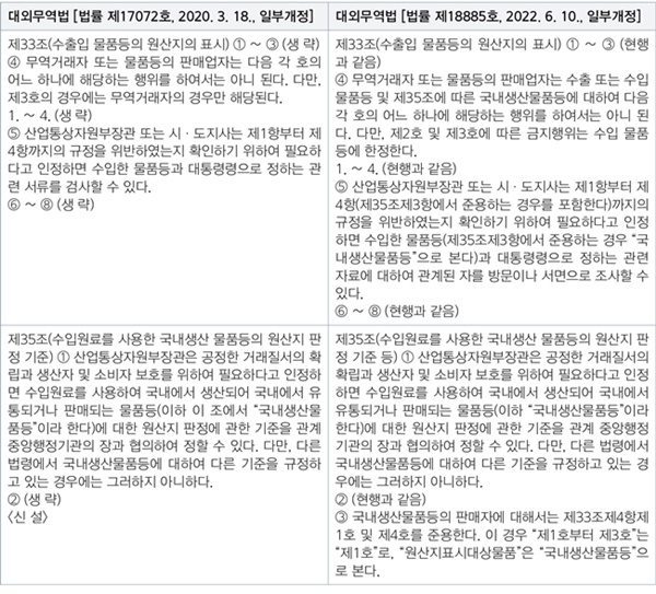 - 제33조 제5항에 위반행위 확인을 위한 물품등의 범위에 제35조 제3항에서 준용하는 경우 “국내생산물품등”으로 본다”는 내용을 추가하여 원산지 표시 위반행위에 대한 단속 근거를 마련함