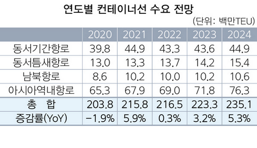 한국해양진흥공사는 컨테이너선 시장 동향 및 전망’ 보고서에서 “컨테이너선은 올 한 해반기 체선 등의 선박 운항 비효율성이 해소되지 않으면서 고운임 기조를 유지하다 2023년과 2024년엔 신조선이 대량 인도되면서 하락 압력이 가중될 것”으로 전망했다.