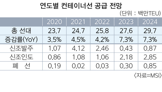공사는 보고서에서 올해 선대 증가율이 3.4%를 기록할 것으로 내다봤다. 신조선 인도량은 100만TEU를 웃돌고 해체량은 3만TEU에도 못 미칠 거란 예상이다. 지난 한 해 16척 1만2000TEU를 기록했던 컨테이너선 해체 실적은 올해 상반기엔 한 척도 올리지 못했다. 영국 해운조사기관인 MSI는 해양진흥공사보다 올해 선대공급 증가율을 높게 봤다.