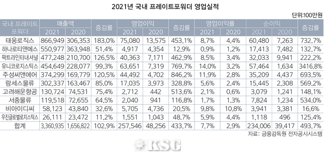 금융감독원 공시에 따르면 2021년 주요 프레이트 포워더 10개사의 별도(개별) 기준 매출액 합계는 총 3조3609억원으로 전년보다 약 2배(103%) 증가했다. 영업이익과 순이익도 각각 2575억원(434%) 2340억원(494%)으로 5배 이상 대폭 늘어났다. 프레이트 포워더 10개사의 평균 영업이익률도 성장했다. 이들의 지난해 영업이익률은 7.7%로 전년보다 4.8%p(포인트) 상승했다. 이 중 유니코로지스틱스와 주성씨앤에어는 두 자릿수 영업이익률을 보이며 괄목할 만한 성과를 냈다.
