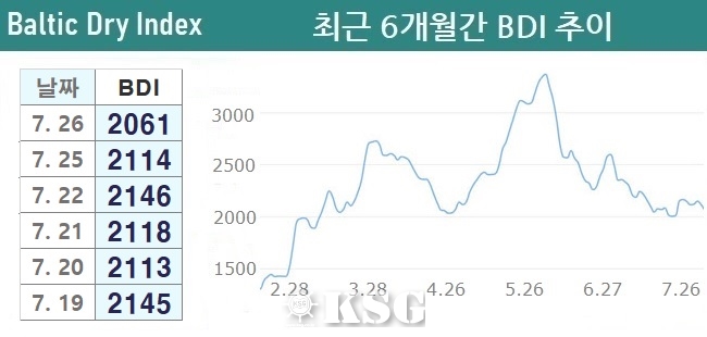 7월26일 벌크 시장은 중소형선에서 하락 전환되며, 모든 선형에서 마이너스를 기록했다. 이날 건화물선 운임지수(BDI)는 전일보다 53포인트 하락한 2061로 마감됐다.