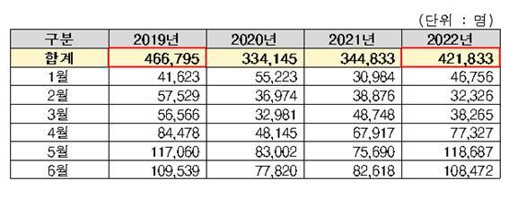 인천항만공사(IPA)는 상반기 인천항 연안여객터미널 이용객이 전년 동기 대비 22.3% 증가한 42만1000명으로 집계됐다고 2일 밝혔다. 이는 코로나19 발생 이전인 2019년 상반기 연안여객 수송실적(46만6000명)의 90% 수준으로 회복한 수치다.