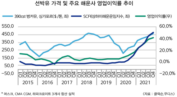 또한 글로벌 주요 해운사의 영업이익률 추이를 보더라도 유가와 영업실적 간 상관관계가 상당히 낮다는 점을 근거로 내세웠다. 김 애널리스트는 “2015년 2분기부터 선박유 가격이 크게 하락했음에도 해운 업황 저하로 마이너스 영업이익률을 기록한 바 있다”며 “반대로 2020년 하반기부터 이어진 선박유 가격 상승에도 역대급 고시황을 맞은 해운사는 우수한 영업실적을 경신했다”고 설명했다.