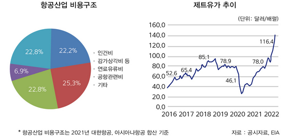 박종도 한신평 선임애널리스트는 “최근 러시아-우크라이나 지정학적 위험으로 국제 유가가 상승함에 따라 2021년 평균 78달러였던 제트유가가 2022년 현재 110달러를 상회하고 있어 항공사 수익성에 실질적인 부담요인으로 작용하고 있다”며 “과거 사례를 보면 제트유가와 항공사 수익성 간에 일정 정도의 상관관계가 있다는 점을 확인할 수 있다”고 밝혔다.