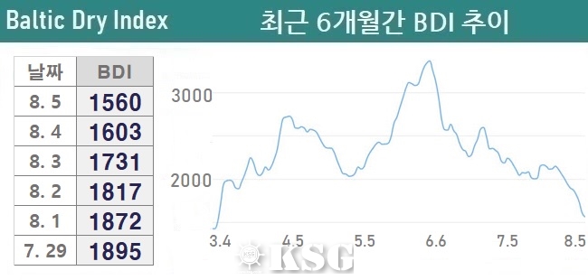 8월5일 건화물선 운임지수(BDI)는 전일보다 43포인트 하락한 1560으로 마감됐다. 지난 주 벌크 시장은 중국에서 부동산 경기 침체와 철광석 수요 부진이 지속되고 있는 가운데 지정학적 불안이 고조됨에 따라 하락세가 지속됐다. 중국발 시황 약세로 인해 해상운임 선물거래(FFA) 시장에서도 급락하면서 선복이 크게 늘어나고 있다.