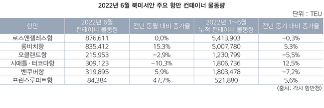 각 항만당국에 따르면 북미 서안 7개 항만의 올해 6월 컨테이너 물동량은 전년 동월 대비 4.5% 증가한 264만1378TEU를 기록했다. 코로나19 이전 시기인 2019년(237만TEU)과 비교해봐도 11.4% 늘어났다.