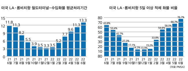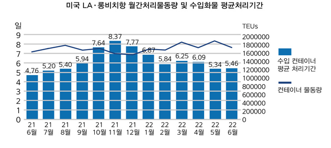 한편 북미서안항만의 컨테이너화물 처리기간이 이달 들어 다시 늘어났다. 미국 오클랜드 소재 태평양상선협회(PMSA)에 따르면 지난 6월 로스앤젤레스(LA) 롱비치 두 항구에서 수입 컨테이너가 화물차에 실려 반출되기까지 걸린 평균 체류기간(dwell time)은 5.5일로 전달(5.3일)보다 소폭(0.2일) 연장됐다. 코로나 팬데믹 이전 시기(2~3일)와 비교해보면 2배 가량 악화된 수준이다.