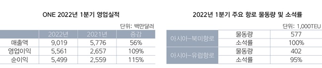 ONE은 2022 회계연도 1분기(4~6월)에 영업이익 55억6100만달러(약 7조3000억원), 순이익 54억9900만달러(약 7조2000억원)를 각각 거뒀다고 밝혔다.