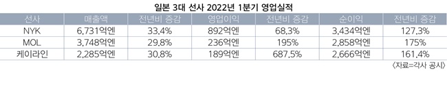 일본 3대 해운사(NYK MOL 케이라인)는 컨테이너선 벌크선 부문에서 안정적인 성장을 구가하며 매출과 이익이 동반 증가하는 호실적을 일궜다. 특히 세 선사는 벌크선 부문에서 두 자릿수의 매출 증가율을 기록했다.