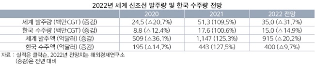 하반기 전 세계 신조선 발주량은 1350만CGT(수정환산톤수) 수준에 그쳐 2022년 총 발주량은 전년 대비 약 32% 감소한 3500만CGT 내외가 될 것으로 내다봤다.