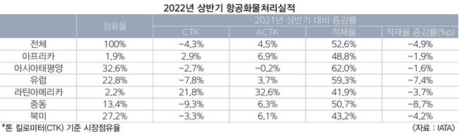 상반기 항공화물 공급성장률(ACTK)은 전년 동기 대비 4.5% 증가했다. IATA 측은 “중국 도시 봉쇄 조치가 완화되면서 6월 들어 무역 활동이 다시 활기를 되찾았고, 중남미·아프리카 등 신흥 지역에서의 물동량 증가세가 도움이 됐다”고 설명했다. 화물적재율은 글로벌 수요 부진에 따라 4.9%포인트(p) 후퇴한 52.6%로 집계됐다. 중국의 제로코로나 정책에 따른 항공편 결항과 러시아·우크라이나 기반의 여러 화물 항공사들의 유럽 취항이 중단되면서 화물 용량 감소로 이어졌다.